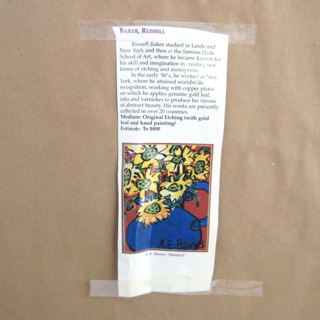 Current Bid: $15.00 [Refresh Price]YOU WILL NEED TO REFRESH THIS PAGE TO SEE UPDATED BID (Log in and this will update automatically) You must LOG IN or REGISTER to see this full page auction listing and bid. Auction is Over Winning Bid Amount: $15.00 **Lot Details: (LOT: A200) - Large Russell Baker Morning Sunlight. Russell Baker studied in Leeds and New York and then at the famous Slade School of Art, where he became known for his skill and imagination in creating new forms of etching and m... Log in to add this lot to your watch list or place a bid |