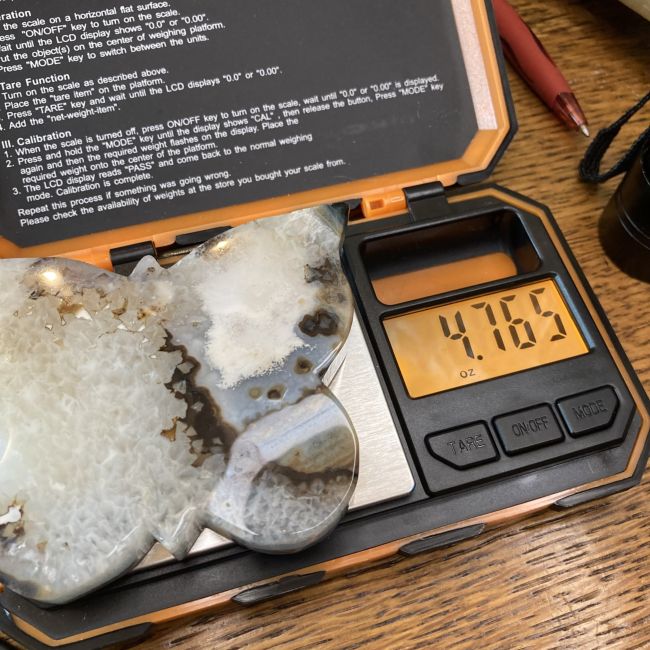 Current Bid: $11.00 [Refresh Price]YOU WILL NEED TO REFRESH THIS PAGE TO SEE UPDATED BID (Log in and this will update automatically) You must LOG IN or REGISTER to see this full page auction listing and bid. Auction is Over Winning Bid Amount: $11.00 **Lot Details: (LOT: A478) - 3.5 inch carved agate butterfly and it looks very different on each side due to where the agate was sliced. This is thick too and weighs 4.75ounces Log in to add this lot to your watch list or place a bid |