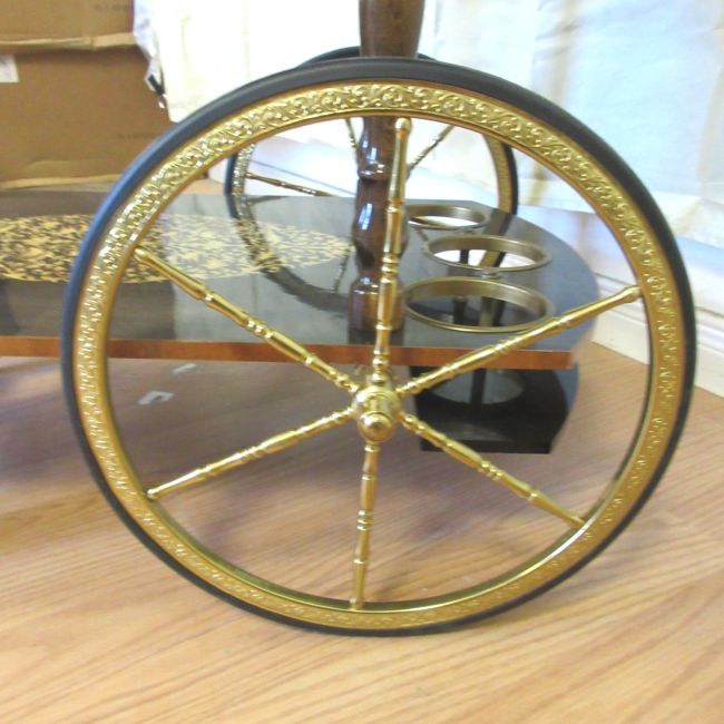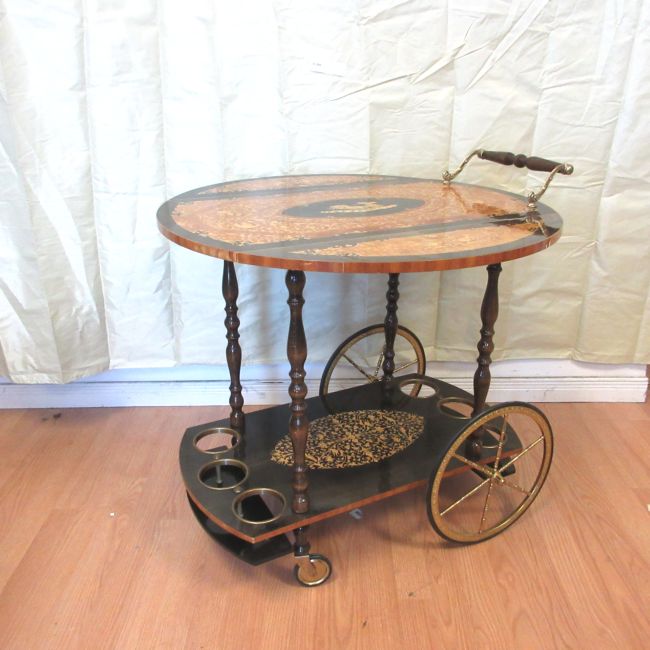 Current Bid: $48.00 [Refresh Price]YOU WILL NEED TO REFRESH THIS PAGE TO SEE UPDATED BID (Log in and this will update automatically) You must LOG IN or REGISTER to see this full page auction listing and bid. Auction is Over Winning Bid Amount: $48.00 **Lot Details: (LOT: A260) - Gorgeous tea or bar cart with golden accents. Italian Marquetry Inlay. exceptional design style. It is 30" tall and 29" long. Log in to add this lot to your watch list or place a bid |