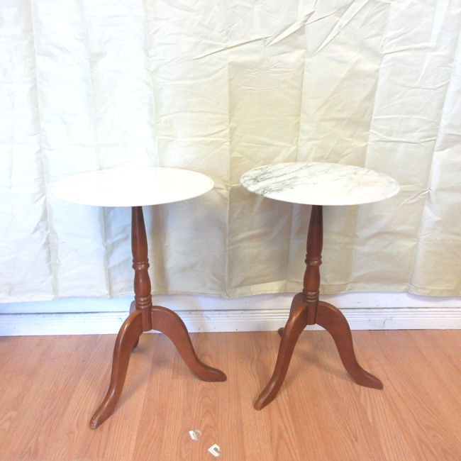 Current Bid: $32.00 [Refresh Price]YOU WILL NEED TO REFRESH THIS PAGE TO SEE UPDATED BID (Log in and this will update automatically) You must LOG IN or REGISTER to see this full page auction listing and bid. Auction is Over Winning Bid Amount: $32.00 **Lot Details: (LOT: A261) - Two marble topped side tables with wood bases. They are 23" tall. Log in to add this lot to your watch list or place a bid |