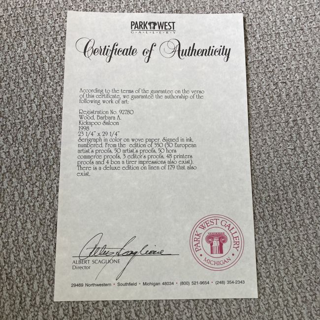 Current Bid: $41.00 [Refresh Price]YOU WILL NEED TO REFRESH THIS PAGE TO SEE UPDATED BID (Log in and this will update automatically) You must LOG IN or REGISTER to see this full page auction listing and bid. Auction is Over Winning Bid Amount: $41.00 **Lot Details: (LOT: A280) - print signed by the artist Barbara Wood called Kickapoo saloon. It is a serigraph. Comes with COA from Park West Gallery as well. it is 30x36 Log in to add this lot to your watch list or place a bid |