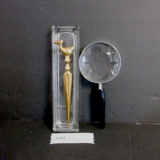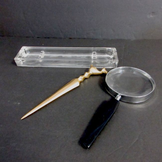Current Bid: $7.00 [Refresh Price]YOU WILL NEED TO REFRESH THIS PAGE TO SEE UPDATED BID (Log in and this will update automatically) You must LOG IN or REGISTER to see this full page auction listing and bid. Auction is Over Winning Bid Amount: $7.00 **Lot Details: (LOT: A284) - Office desk with a brass opener, a pen tray and a magnifying glass Log in to add this lot to your watch list or place a bid |