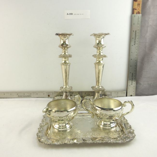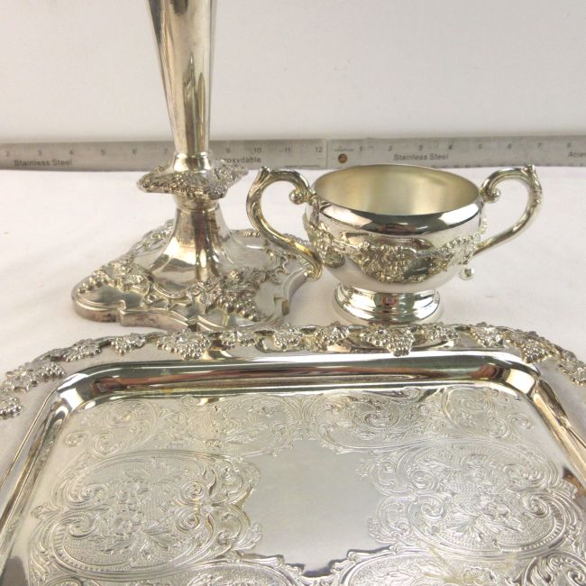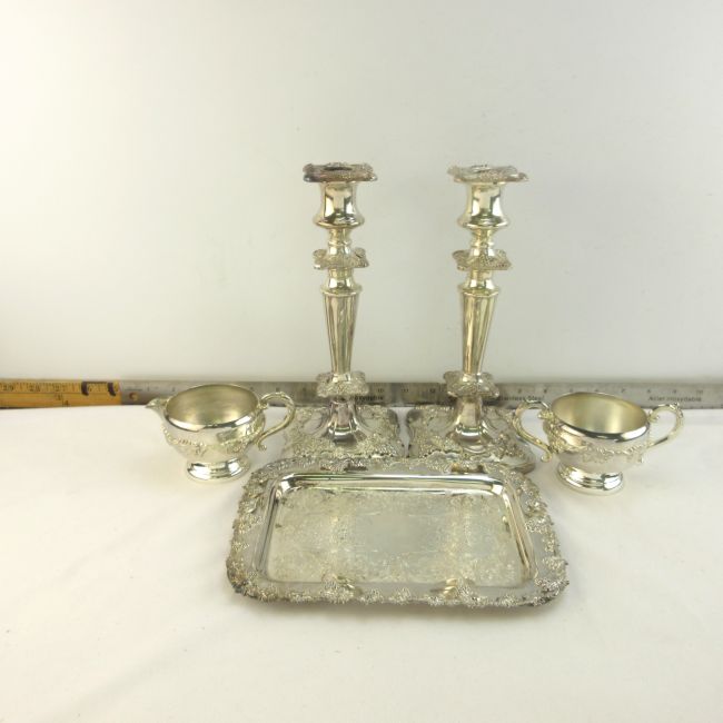 Current Bid: $17.00 [Refresh Price]YOU WILL NEED TO REFRESH THIS PAGE TO SEE UPDATED BID (Log in and this will update automatically) You must LOG IN or REGISTER to see this full page auction listing and bid. Auction is Over Winning Bid Amount: $17.00 **Lot Details: (LOT: A359) - A lot of grape motif silver plate with two candlestick holders that are very heavy and cream and sugar on a tray Log in to add this lot to your watch list or place a bid |