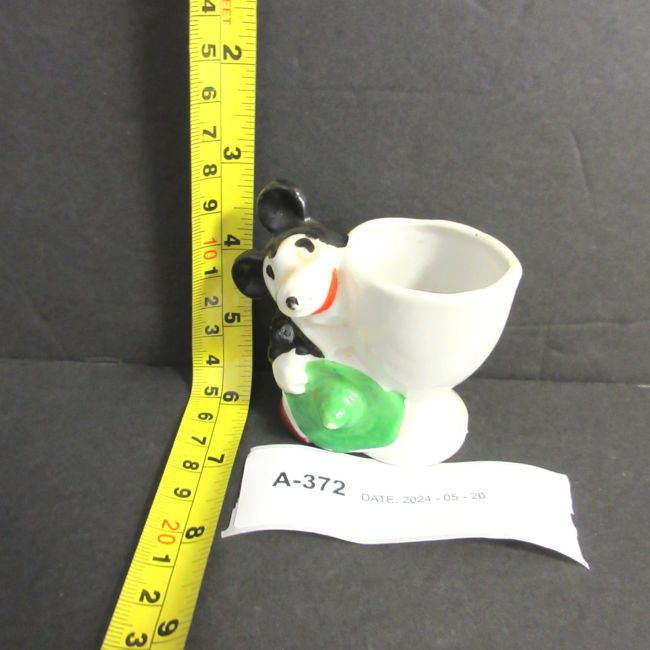 Current Bid: $17.00 [Refresh Price]YOU WILL NEED TO REFRESH THIS PAGE TO SEE UPDATED BID (Log in and this will update automatically) You must LOG IN or REGISTER to see this full page auction listing and bid. Auction is Over Winning Bid Amount: $17.00 **Lot Details: (LOT: A372) - Unique Find-STEAMBOAT WILLIE Mouse Ceramic Egg Cup circa 1950-Good Condition- Has Faint Crack Near Edge of Cup Log in to add this lot to your watch list or place a bid |