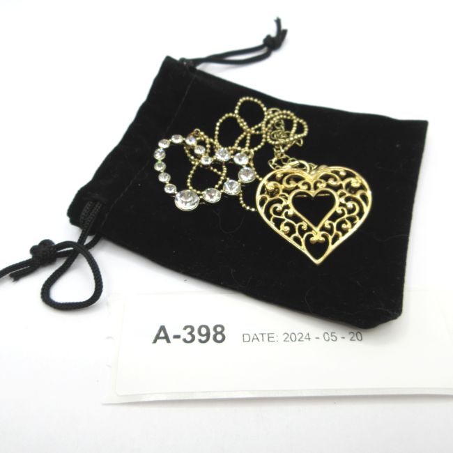 Current Bid: $[Refresh Price]YOU WILL NEED TO REFRESH THIS PAGE TO SEE UPDATED BID (Log in and this will update automatically) You must LOG IN or REGISTER to see this full page auction listing and bid. Auction is Over Winning Bid Amount: $This item did not sell **Lot Details: (LOT: A398) - Heart Necklace: Fashion jewelry. Necklace has cubic zirconia stones, gold tone chain. Heart pin is gold toned. New and would make a very nice gift, comes with a velvet pouch. Log in to add this lot to your watch list or place a bid |