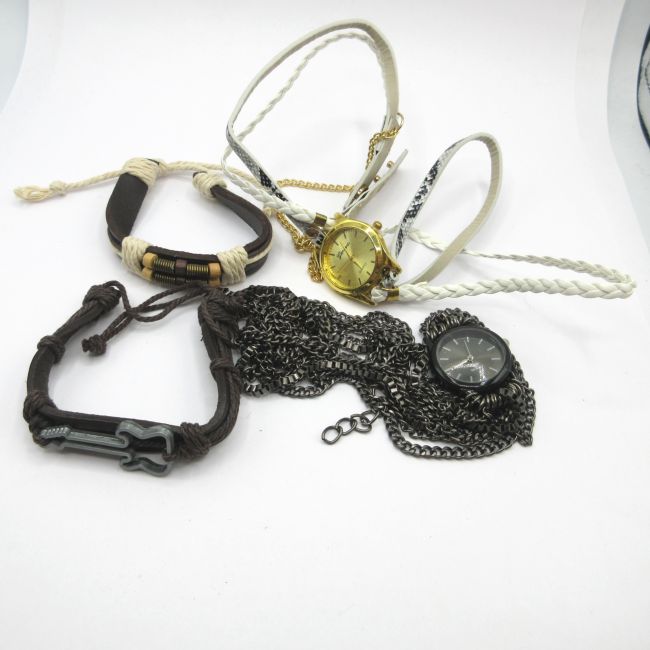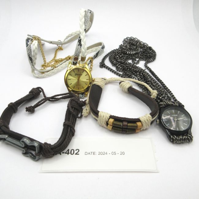 Current Bid: $5.00 [Refresh Price]YOU WILL NEED TO REFRESH THIS PAGE TO SEE UPDATED BID (Log in and this will update automatically) You must LOG IN or REGISTER to see this full page auction listing and bid. Auction is Over Winning Bid Amount: $5.00 **Lot Details: (LOT: A402) - Leather Bracelets: 2 adjustable bracelets one has a guitar on it. Also 2 funky watch bracelets. New but one needs a battery. Log in to add this lot to your watch list or place a bid |
