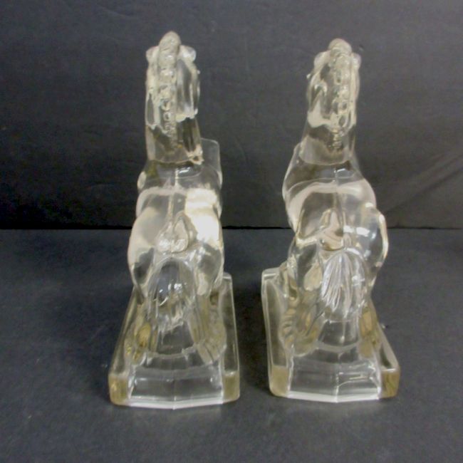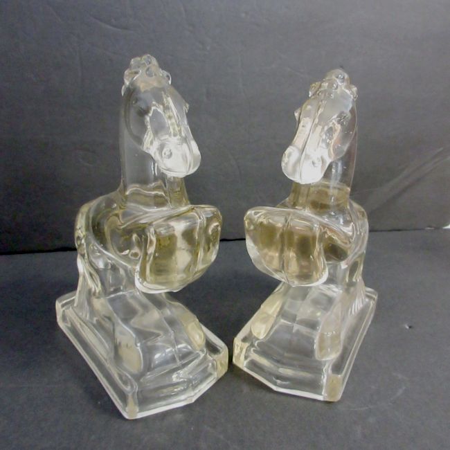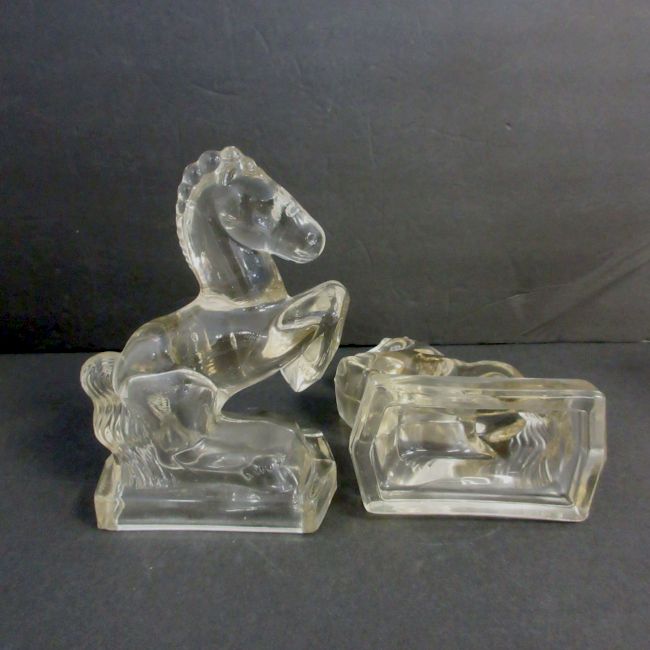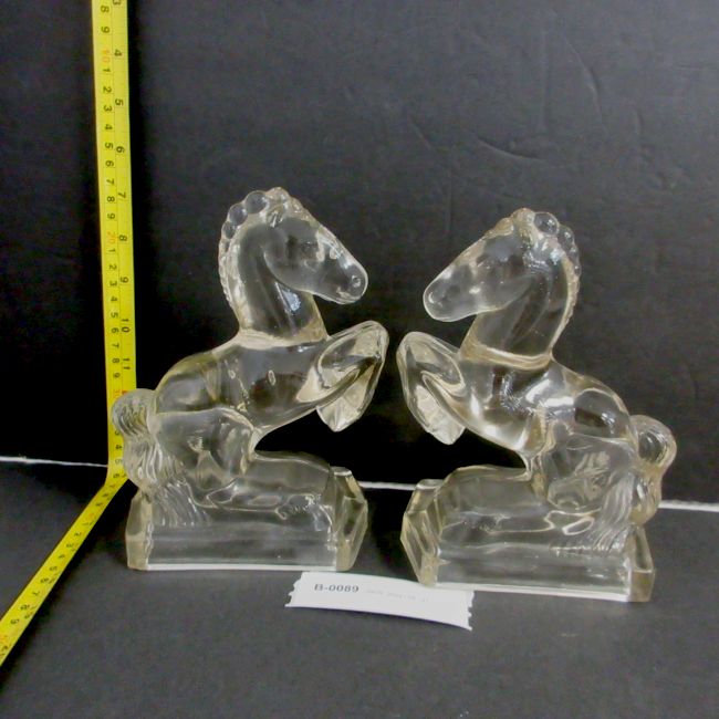 Current Bid: $5.00 [Refresh Price]YOU WILL NEED TO REFRESH THIS PAGE TO SEE UPDATED BID (Log in and this will update automatically) You must LOG IN or REGISTER to see this full page auction listing and bid. Auction is Over Winning Bid Amount: $5.00 **Lot Details: (LOT: B89) - Pair of depression era pressed glass Rearing Horse Bookends (candy decanters). Heavy Clear Figurines, These original were sold full of small candies with a wax seal bottom and made to be functional when empty Log in to add this lot to your watch list or place a bid |