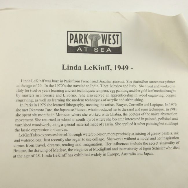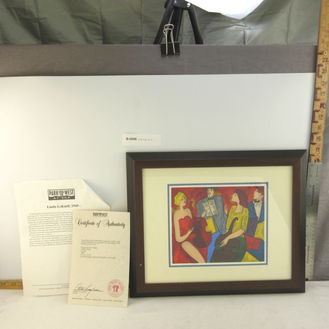 Current Bid: $9.00 [Refresh Price]YOU WILL NEED TO REFRESH THIS PAGE TO SEE UPDATED BID (Log in and this will update automatically) You must LOG IN or REGISTER to see this full page auction listing and bid. Auction is Over Winning Bid Amount: $9.00 **Lot Details: (LOT: B98) - Very nice Linda LeKinff lithograph with a certificate of authenticity it is a serial lithograph signed by artist Log in to add this lot to your watch list or place a bid |