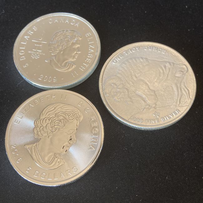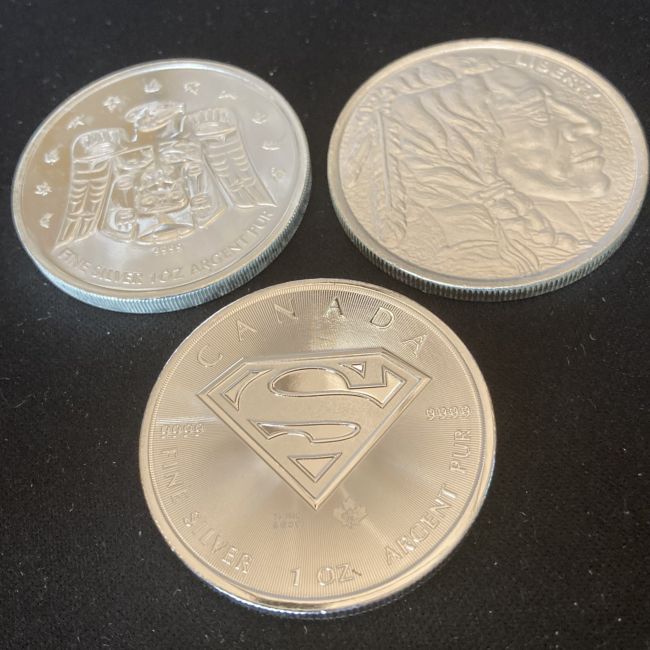 Current Bid: $139.00 [Refresh Price]YOU WILL NEED TO REFRESH THIS PAGE TO SEE UPDATED BID (Log in and this will update automatically) You must LOG IN or REGISTER to see this full page auction listing and bid. Auction is Over Winning Bid Amount: $139.00 **Lot Details: (LOT: B768) - THREE 1oz fine silver rounds! 3oz total. TAX FREE bullion. Canada SUPERMAN .9999, 2009 Canada Thunderbird Olympic .9999 and a USA Buffalo .999 satin finish round. ALL NICE AND MINTY! Log in to add this lot to your watch list or place a bid |