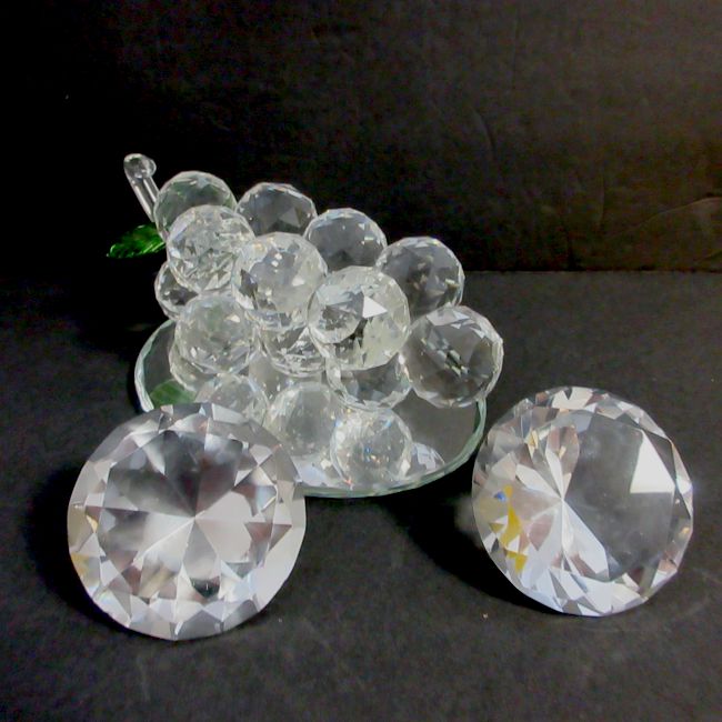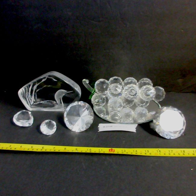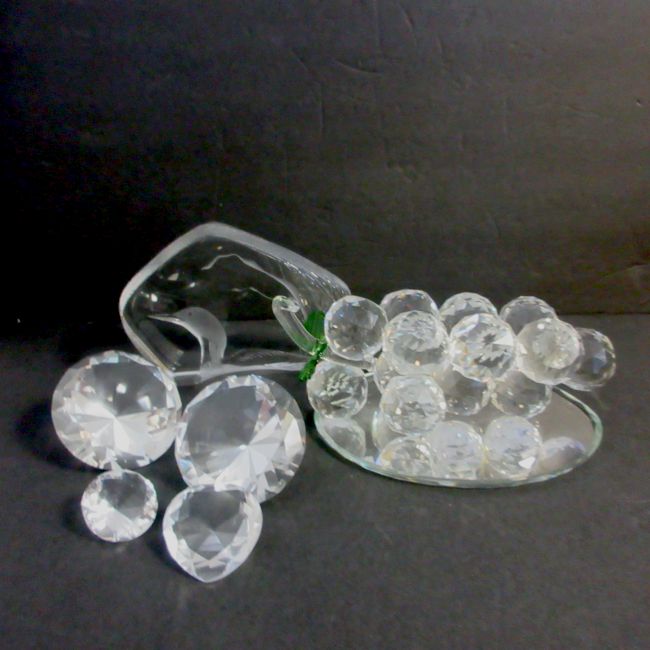 Current Bid: $5.00 [Refresh Price]YOU WILL NEED TO REFRESH THIS PAGE TO SEE UPDATED BID (Log in and this will update automatically) You must LOG IN or REGISTER to see this full page auction listing and bid. Auction is Over Winning Bid Amount: $5.00 **Lot Details: (LOT: B106) - A large cluster of crystal-clear grapes with green leaves, mounted on an oval mirrored base. Measures 9” long by 3.75” high by 5.75” wide. Each grape is about 1.5 long. There is a piece missing on the inside st... Log in to add this lot to your watch list or place a bid |