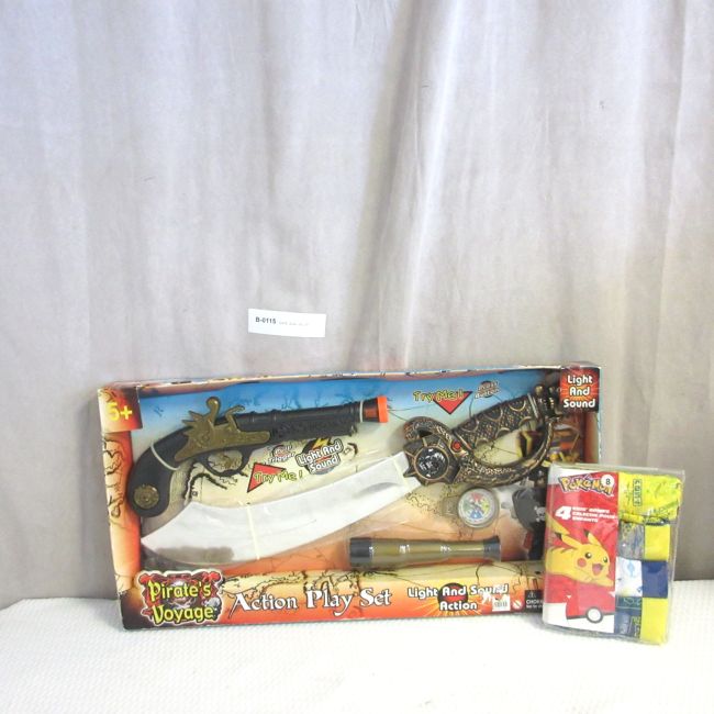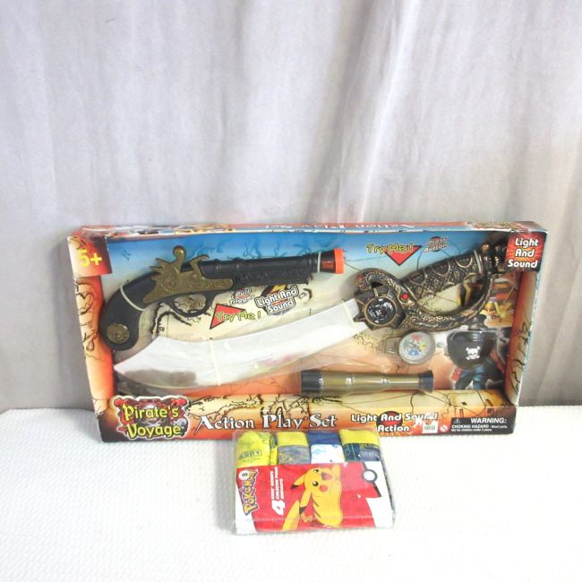 Current Bid: $7.00 [Refresh Price]YOU WILL NEED TO REFRESH THIS PAGE TO SEE UPDATED BID (Log in and this will update automatically) You must LOG IN or REGISTER to see this full page auction listing and bid. Auction is Over Winning Bid Amount: $7.00 **Lot Details: (LOT: B115) - 4-brand new pairs of boy’s briefs, size 8 with Pokemon designs, Plus, a pirate action play set. Light and sound. Needs batteries. Age 5+ Log in to add this lot to your watch list or place a bid |