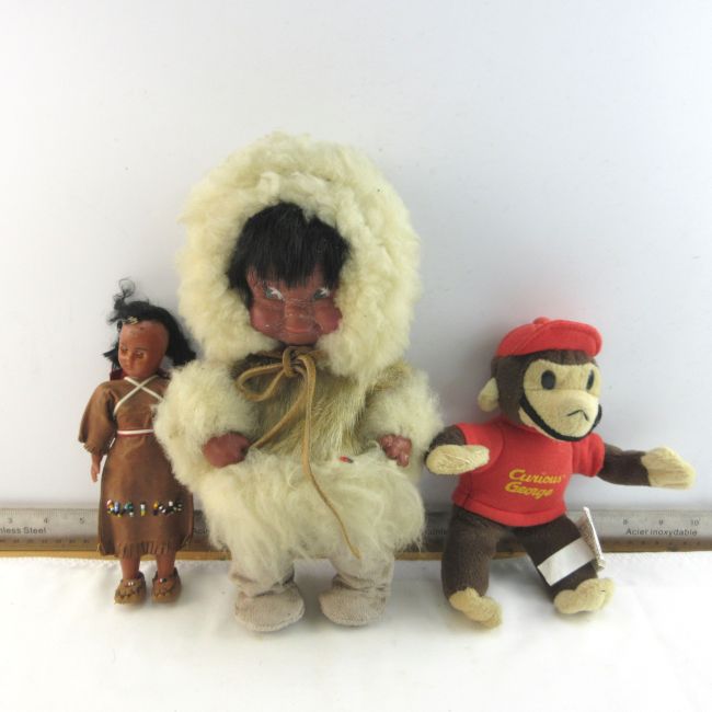 Current Bid: $7.00 [Refresh Price]YOU WILL NEED TO REFRESH THIS PAGE TO SEE UPDATED BID (Log in and this will update automatically) You must LOG IN or REGISTER to see this full page auction listing and bid. Auction is Over Winning Bid Amount: $7.00 **Lot Details: (LOT: B306) - Vintage Indigenous Northern Doll, In Seal Skin & Fur Clothing, 11” High, Vintage Doll Mother With Papoose & Beaded Dress, Sleeping Eyes, 7” Tall, & Curious George Small Stuffie Log in to add this lot to your watch list or place a bid |