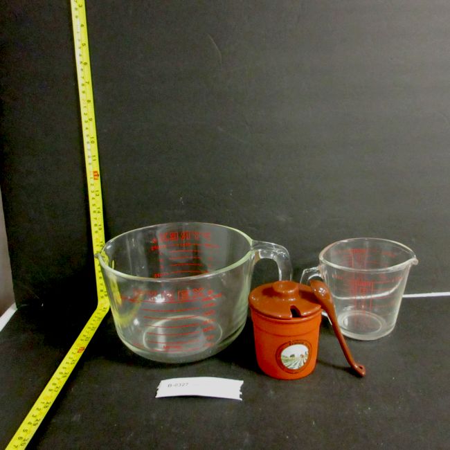 Current Bid: $11.00 [Refresh Price]YOU WILL NEED TO REFRESH THIS PAGE TO SEE UPDATED BID (Log in and this will update automatically) You must LOG IN or REGISTER to see this full page auction listing and bid. Auction is Over Winning Bid Amount: $11.00 **Lot Details: (LOT: B327) - Lot of two PYREX measuring cups, and a little jam or honeypot Log in to add this lot to your watch list or place a bid |