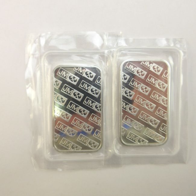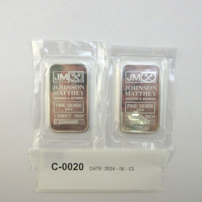 Current Bid: $92.00 [Refresh Price]YOU WILL NEED TO REFRESH THIS PAGE TO SEE UPDATED BID (Log in and this will update automatically) You must LOG IN or REGISTER to see this full page auction listing and bid. Auction is Over Winning Bid Amount: $92.00 **Lot Details: (LOT: C20) - Canada, Lot of Two Johnson Matthey One Ounce Silver Bars. Classic Canadian Bars that have been serialized. Mint in original packaging. Log in to add this lot to your watch list or place a bid |