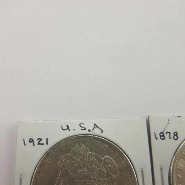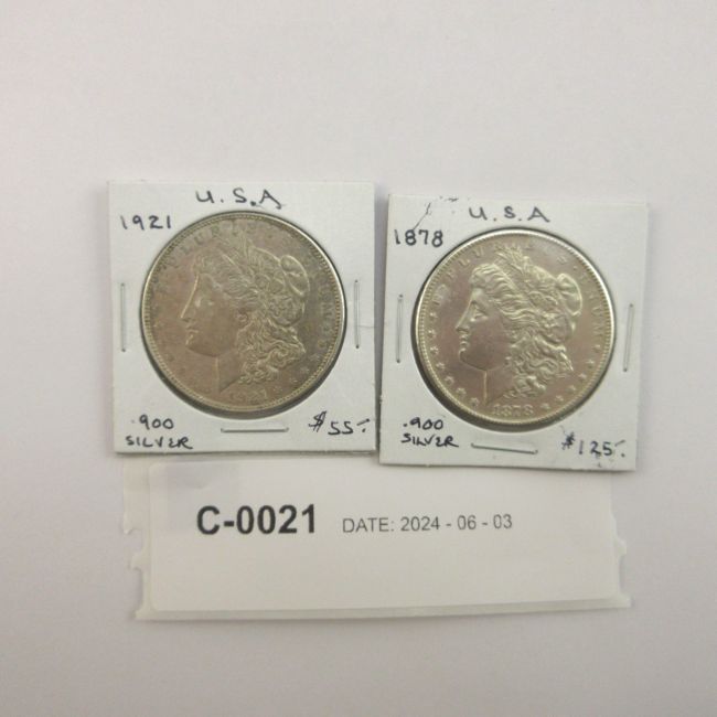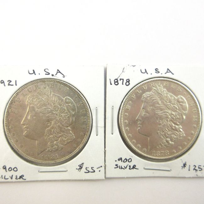 Current Bid: $86.00 [Refresh Price]YOU WILL NEED TO REFRESH THIS PAGE TO SEE UPDATED BID (Log in and this will update automatically) You must LOG IN or REGISTER to see this full page auction listing and bid. Auction is Over Winning Bid Amount: $86.00 **Lot Details: (LOT: C21) - USA Two Beautiful Morgan Silver Dollars. 1878 Full Feather Details, Gorgeous Condition. 1921 Showing very light wear. Both are .900 Silver. Log in to add this lot to your watch list or place a bid |