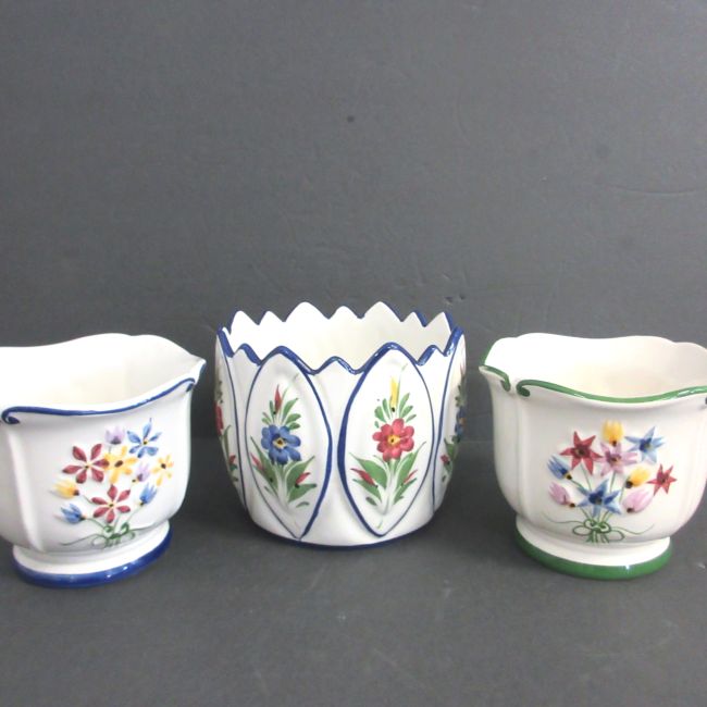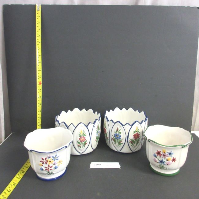 Current Bid: $16.00 [Refresh Price]YOU WILL NEED TO REFRESH THIS PAGE TO SEE UPDATED BID (Log in and this will update automatically) You must LOG IN or REGISTER to see this full page auction listing and bid. Auction is Over Winning Bid Amount: $16.00 **Lot Details: (LOT: C61) - Four pots for plants Two are 6” X 5” tall and two are 5.5” X 4.5” tall. All are hand painted, numbered and made in Portugal. Little water wear on the inside but perfect condition on the outside. Log in to add this lot to your watch list or place a bid |