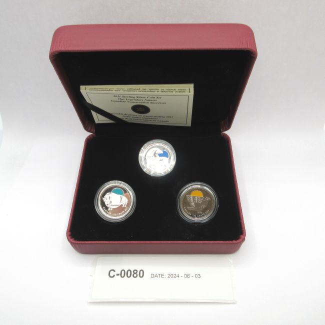 Current Bid: $42.00 [Refresh Price]YOU WILL NEED TO REFRESH THIS PAGE TO SEE UPDATED BID (Log in and this will update automatically) You must LOG IN or REGISTER to see this full page auction listing and bid. Auction is Over Winning Bid Amount: $42.00 **Lot Details: (LOT: C80) - 2011 Fine Silver .9999 Coin Set RCM. Our Legendary Nature: Canadian Conservation Successes. COA 1140/10,000. Clamshell and beauty box Log in to add this lot to your watch list or place a bid |