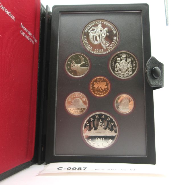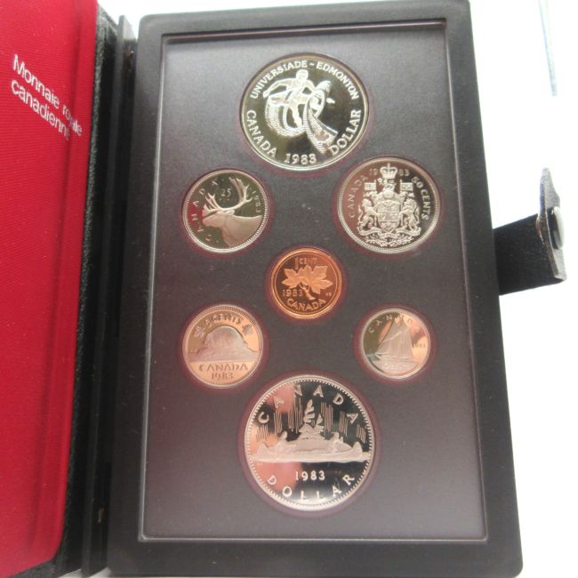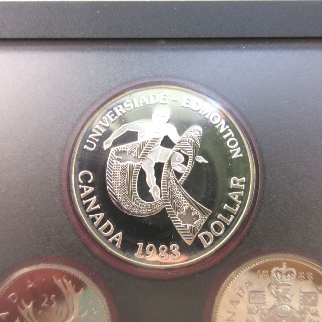 Current Bid: $25.00 [Refresh Price]YOU WILL NEED TO REFRESH THIS PAGE TO SEE UPDATED BID (Log in and this will update automatically) You must LOG IN or REGISTER to see this full page auction listing and bid. Auction is Over Winning Bid Amount: $25.00 **Lot Details: (LOT: C87) - 1983 RCM 7 coin specimen set with silver Edmonton coin. 1983 Royal Canadian Mint 7 coin Proof Set with 50% silver "Universiade in Edmonton" dollar... Log in to add this lot to your watch list or place a bid |