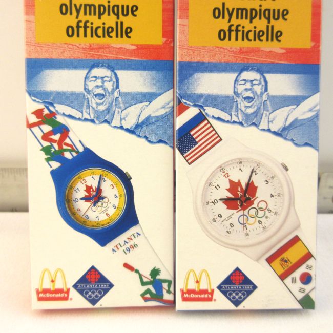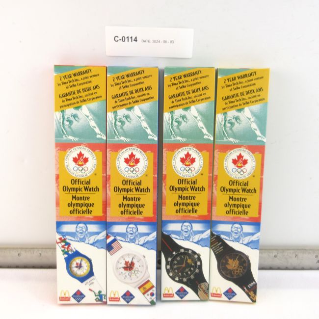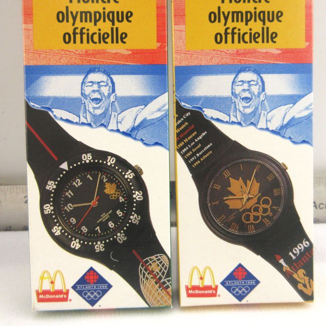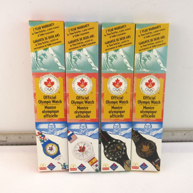 Current Bid: $28.99 [Refresh Price]YOU WILL NEED TO REFRESH THIS PAGE TO SEE UPDATED BID (Log in and this will update automatically) You must LOG IN or REGISTER to see this full page auction listing and bid. Auction is Over Winning Bid Amount: $28.99 **Lot Details: (LOT: C114) - McDonald's Seiko Official Olympic Watches (4) - Atlanta 1996. 1 - larger white face with maple leaf and Olympic rings and flags on the wristband; 2 - larger black face with gold maple leaf and 'citius altius fo... Log in to add this lot to your watch list or place a bid |