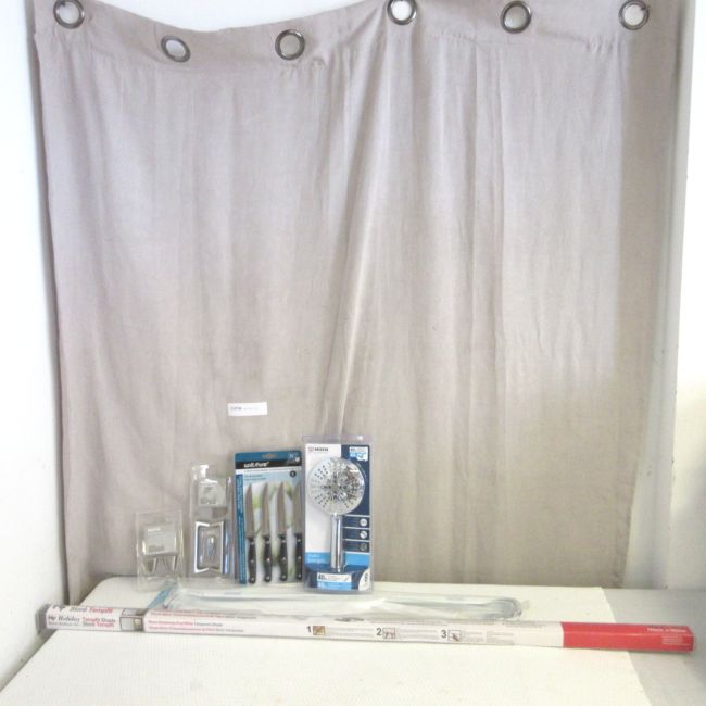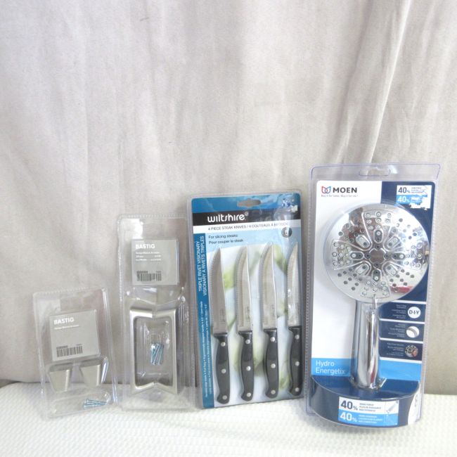 Current Bid: $5.00 [Refresh Price]YOU WILL NEED TO REFRESH THIS PAGE TO SEE UPDATED BID (Log in and this will update automatically) You must LOG IN or REGISTER to see this full page auction listing and bid. Auction is Over Winning Bid Amount: $5.00 **Lot Details: (LOT: C134) - Assortment of household items, all new in original unopened packaging: Showerhead. Moen Energetix Shower Head - new in packaging; Wiltshire 4 piece steak knives; IKEA knobs and handles unopened brushed steel look; Te... Log in to add this lot to your watch list or place a bid |