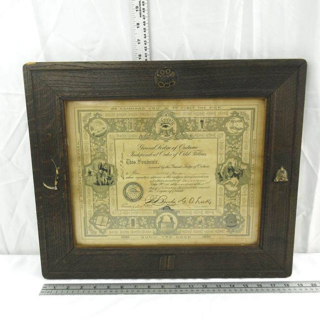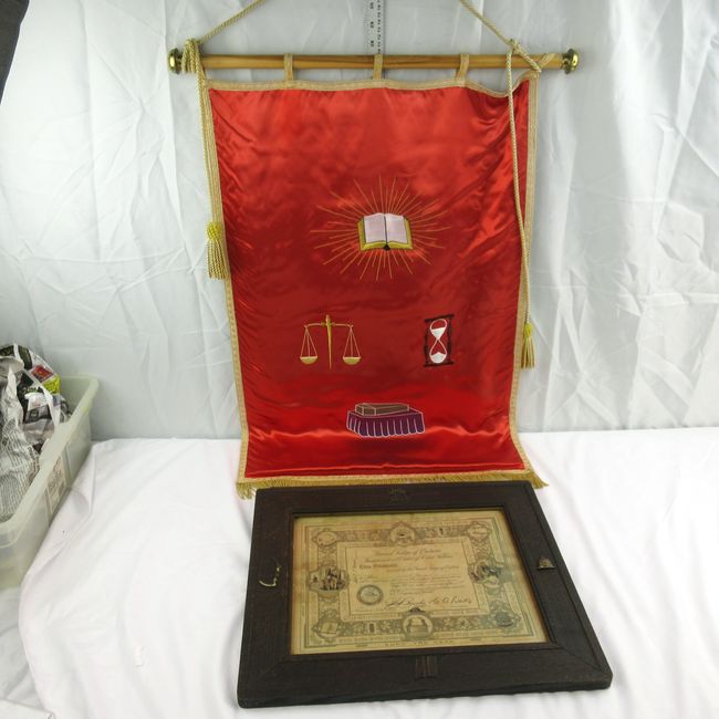 Current Bid: $64.00 [Refresh Price]YOU WILL NEED TO REFRESH THIS PAGE TO SEE UPDATED BID (Log in and this will update automatically) You must LOG IN or REGISTER to see this full page auction listing and bid. Auction is Over Winning Bid Amount: $64.00 **Lot Details: (LOT: Y308) - Odd Fellows lodge scroll tapestry Banner and Grand lodge Certificate/Plaque 1846 Gananoque Lodge. Masons collectable. Great wooden Order of the odd fellows frame too! Log in to add this lot to your watch list or place a bid |