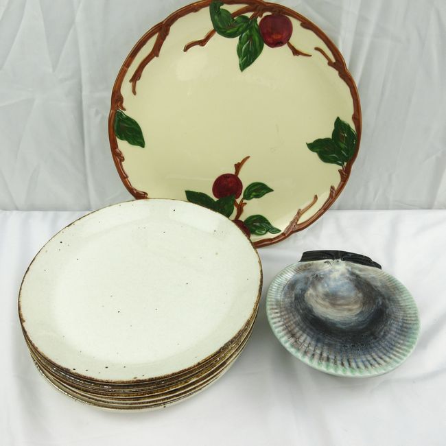 Current Bid: $5.00 [Refresh Price]YOU WILL NEED TO REFRESH THIS PAGE TO SEE UPDATED BID (Log in and this will update automatically) You must LOG IN or REGISTER to see this full page auction listing and bid. Auction is Over Winning Bid Amount: $5.00 **Lot Details: (LOT: Y317) - Vintage Shell plates, 5 of them and 8 J and G Meakin Ware, England~ Speckled dinner plates plus a Large apple decorated platter. Made in California, Fransican Pottery. Log in to add this lot to your watch list or place a bid |