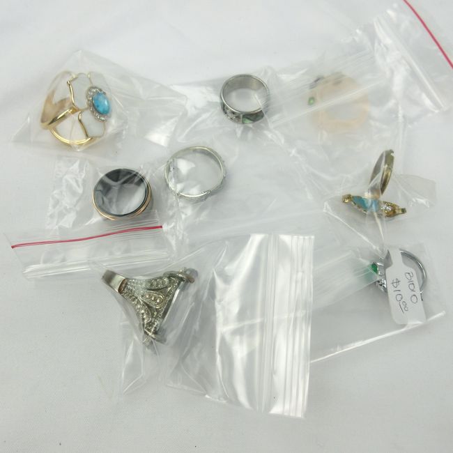 Current Bid: $9.00 [Refresh Price]YOU WILL NEED TO REFRESH THIS PAGE TO SEE UPDATED BID (Log in and this will update automatically) You must LOG IN or REGISTER to see this full page auction listing and bid. Auction is Over Winning Bid Amount: $9.00 **Lot Details: (LOT: Y337) - An assortment of 25 rings, many are new and some are lightly used. Different sizes and shapes Log in to add this lot to your watch list or place a bid |