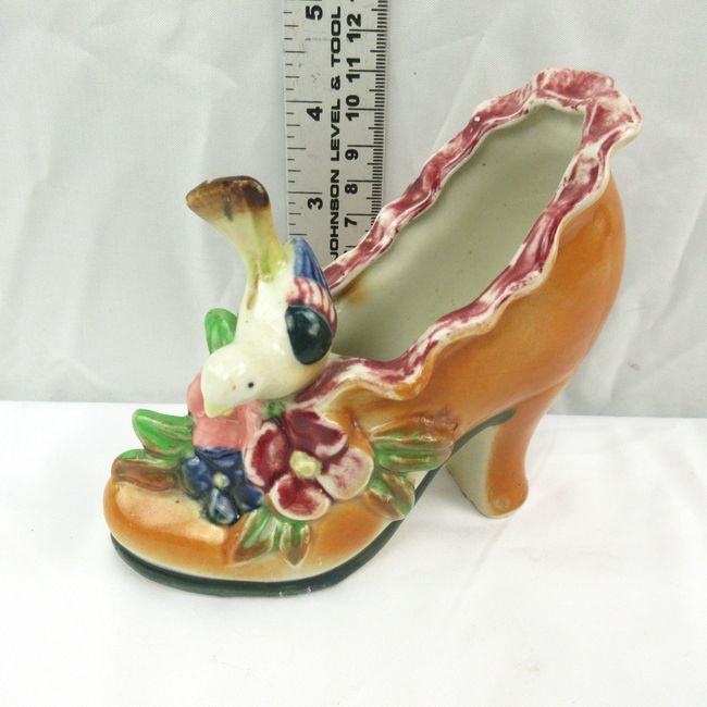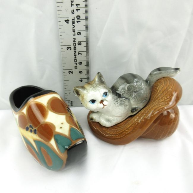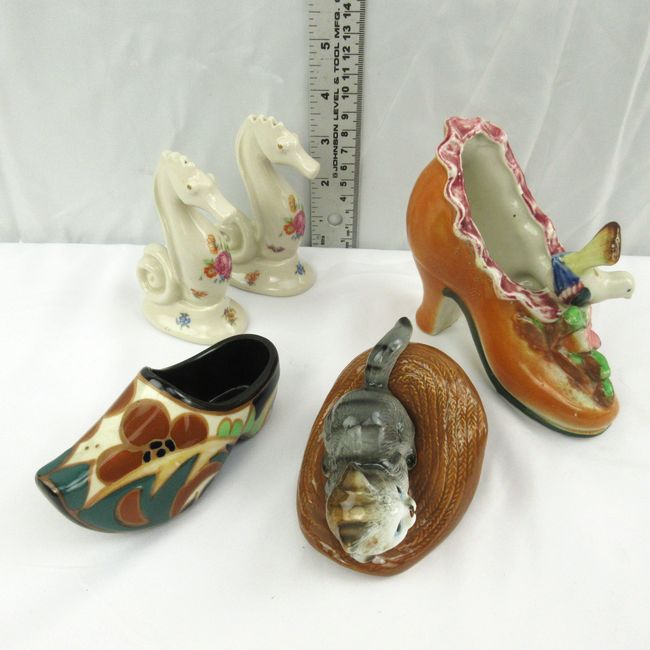 Current Bid: $5.00 [Refresh Price]YOU WILL NEED TO REFRESH THIS PAGE TO SEE UPDATED BID (Log in and this will update automatically) You must LOG IN or REGISTER to see this full page auction listing and bid. Auction is Over Winning Bid Amount: $5.00 **Lot Details: (LOT: Y342) - A pair of vintage Seashore 4`` tall salt and pepper, made of fine China. A vintage ceramic shoe decorated with flowers and a small bird, 4`` tall X 6`` long, no marks. A smaller shoe which looks like a Holland shoe, made in Japan, Log in to add this lot to your watch list or place a bid |