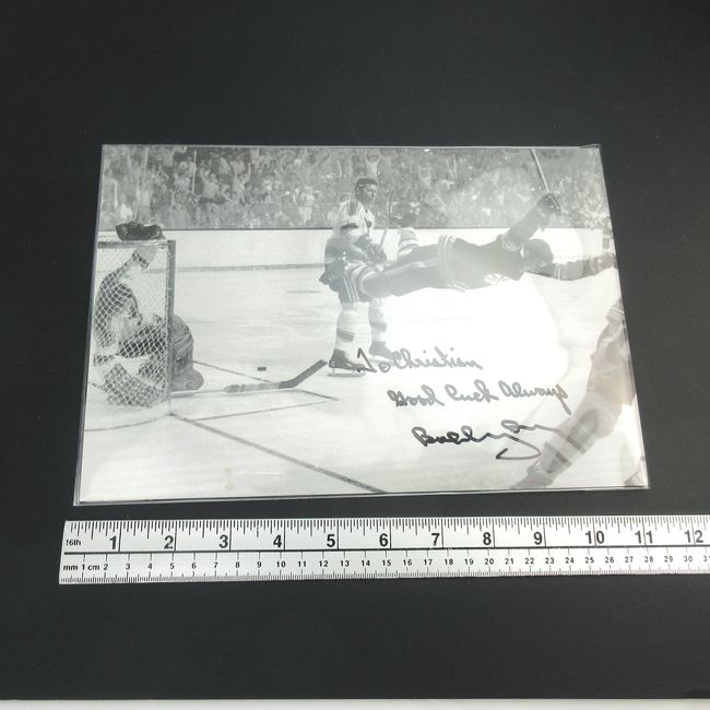 Current Bid: $30.35 [Refresh Price]YOU WILL NEED TO REFRESH THIS PAGE TO SEE UPDATED BID (Log in and this will update automatically) You must LOG IN or REGISTER to see this full page auction listing and bid. Auction is Over Winning Bid Amount: $30.35 **Lot Details: (LOT: Z69) - Iconic 9``x 11`` Bobby Orr photo signed by the Hall of Fame legend. Log in to add this lot to your watch list or place a bid |