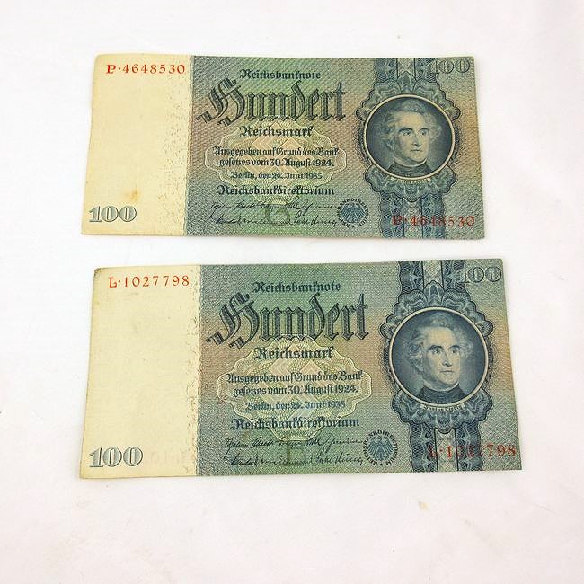 Current Bid: $27.00 [Refresh Price]YOU WILL NEED TO REFRESH THIS PAGE TO SEE UPDATED BID (Log in and this will update automatically) You must LOG IN or REGISTER to see this full page auction listing and bid. Auction is Over Winning Bid Amount: $27.00 **Lot Details: (LOT: Z219) - Two Reichsmark banknotes from Germany, Both issued on June 24, 1935. Key details include: Reichsmark, subdivided into 100 Reichspfennig. Based on the Bank Act of August 30, 1924. June 24, 1935. Features Justus von Liebig, a German che Log in to add this lot to your watch list or place a bid |