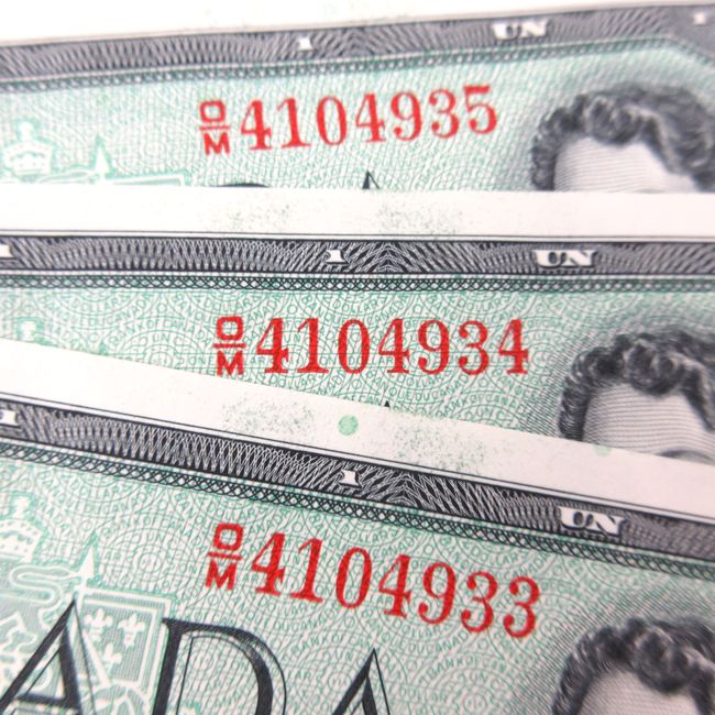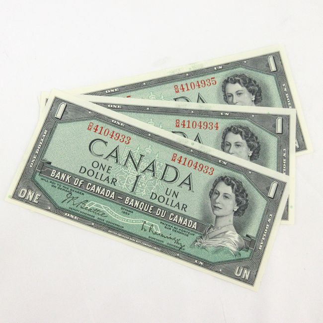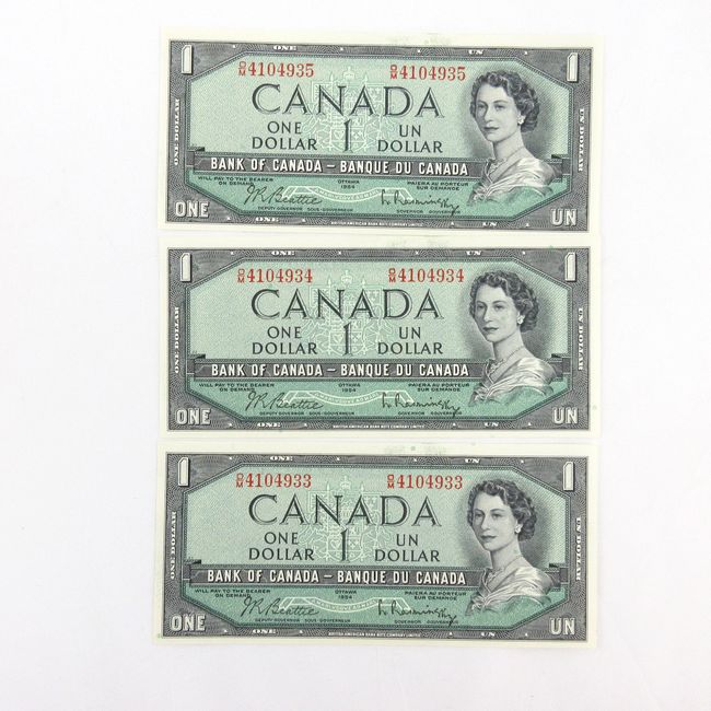 Current Bid: $27.00 [Refresh Price]YOU WILL NEED TO REFRESH THIS PAGE TO SEE UPDATED BID (Log in and this will update automatically) You must LOG IN or REGISTER to see this full page auction listing and bid. Auction is Over Winning Bid Amount: $27.00 **Lot Details: (LOT: B19) - Canada, Lot of Three Sequential, 1954 One Dollar Banknotes. These Three Banknotes are Gem Uncirculated from an Original Brick. Beautiful Trio. Log in to add this lot to your watch list or place a bid |