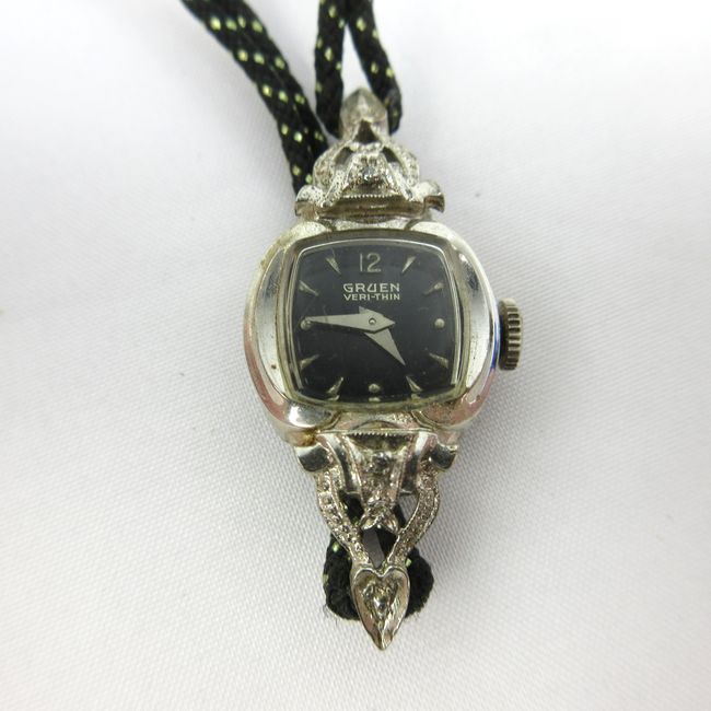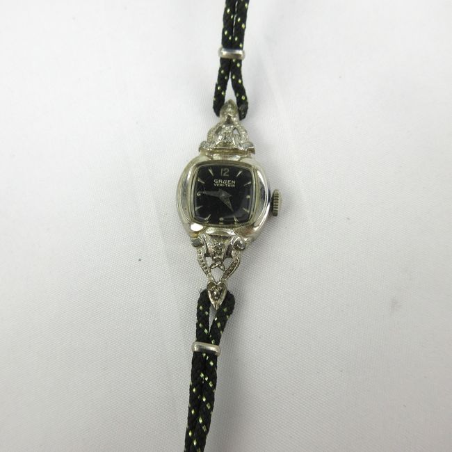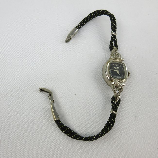 Current Bid: $9.00 [Refresh Price]YOU WILL NEED TO REFRESH THIS PAGE TO SEE UPDATED BID (Log in and this will update automatically) You must LOG IN or REGISTER to see this full page auction listing and bid. Auction is Over Winning Bid Amount: $9.00 **Lot Details: (LOT: B33) - Gruen ladies watch. Black face, diamond accents, 10KT rolled gold plate. This stunning vintage piece is timeless. Log in to add this lot to your watch list or place a bid |