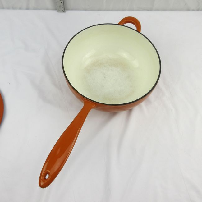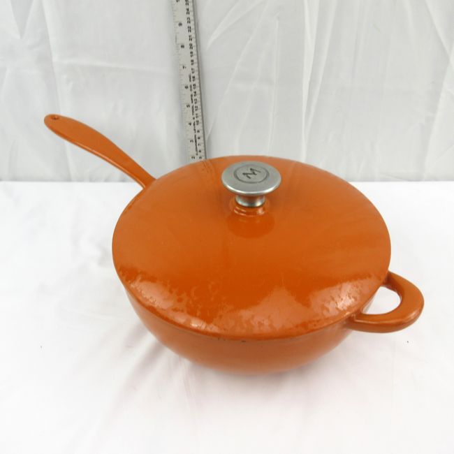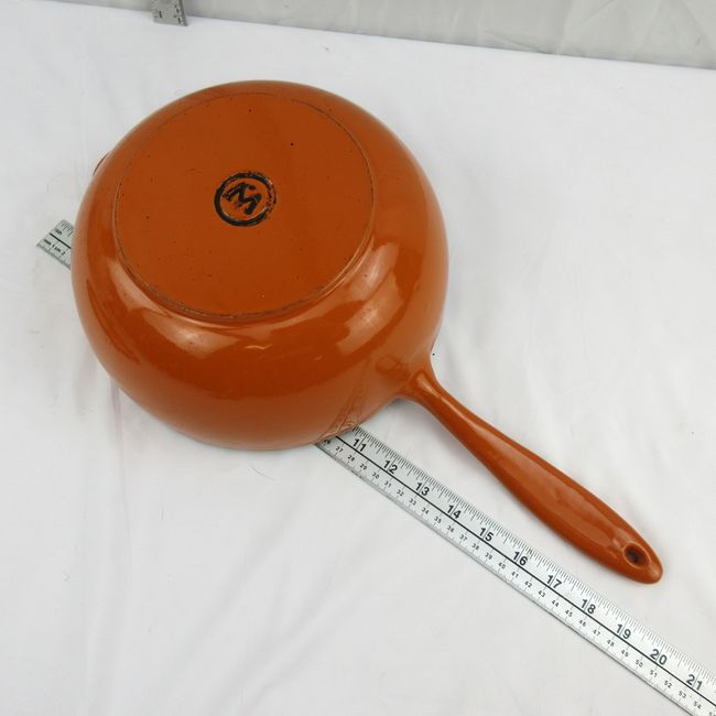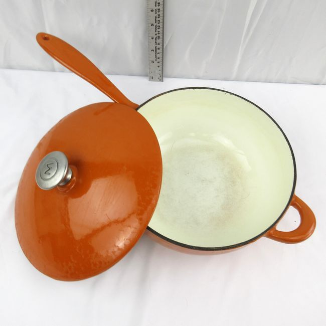 Current Bid: $15.00 [Refresh Price]YOU WILL NEED TO REFRESH THIS PAGE TO SEE UPDATED BID (Log in and this will update automatically) You must LOG IN or REGISTER to see this full page auction listing and bid. Auction is Over Winning Bid Amount: $15.00 **Lot Details: (LOT: B97) - A large and heavy vintage Mario Battali cast iron orange enamel lidded pot with handle. This was made by Dansk and is very high quality. Some signs of age, like some marring on the enameled lid and light marks inside, but still in ove Log in to add this lot to your watch list or place a bid |