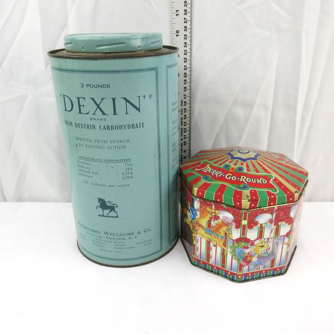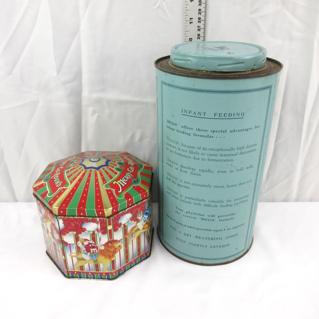 Current Bid: $5.00 [Refresh Price]YOU WILL NEED TO REFRESH THIS PAGE TO SEE UPDATED BID (Log in and this will update automatically) You must LOG IN or REGISTER to see this full page auction listing and bid. Auction is Over Winning Bid Amount: $5.00 **Lot Details: (LOT: B130) - Two display tins: M and M Merry Go Round will all the characters on rides, a beautiful :Tiffany`` blue Dexin tin. Dexin was developed as a milk modifier for infant feeding formula in the 1940s. Log in to add this lot to your watch list or place a bid |