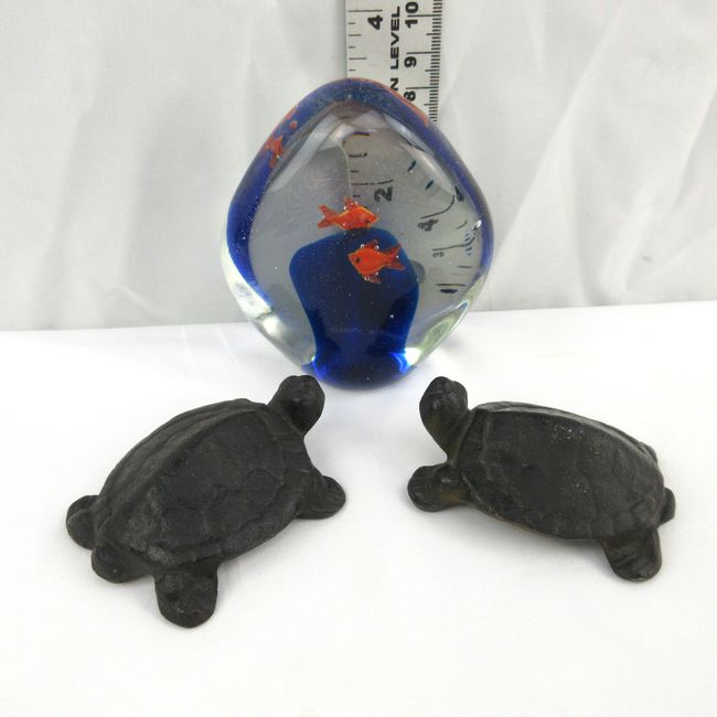 Current Bid: $16.00 [Refresh Price]YOU WILL NEED TO REFRESH THIS PAGE TO SEE UPDATED BID (Log in and this will update automatically) You must LOG IN or REGISTER to see this full page auction listing and bid. Auction is Over Winning Bid Amount: $16.00 **Lot Details: (LOT: B142) - Vintage Cast Iron Turtle figures with Glass Paperweight with Goldfish and bubbles Log in to add this lot to your watch list or place a bid |