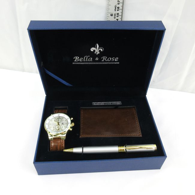 Current Bid: $27.00 [Refresh Price]YOU WILL NEED TO REFRESH THIS PAGE TO SEE UPDATED BID (Log in and this will update automatically) You must LOG IN or REGISTER to see this full page auction listing and bid. Auction is Over Winning Bid Amount: $27.00 **Lot Details: (LOT: B284) - Bella and Rose Mens gift set, watch, pen, bussiness card holder. Log in to add this lot to your watch list or place a bid |
