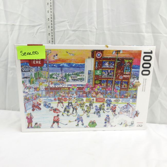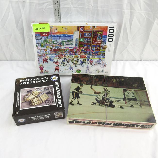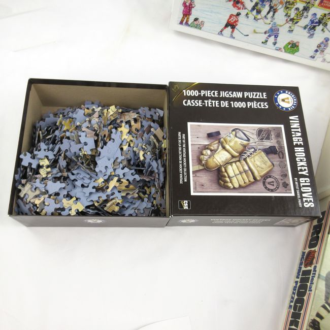 Current Bid: $11.00 [Refresh Price]YOU WILL NEED TO REFRESH THIS PAGE TO SEE UPDATED BID (Log in and this will update automatically) You must LOG IN or REGISTER to see this full page auction listing and bid. Auction is Over Winning Bid Amount: $11.00 **Lot Details: (LOT: B288) - PUZZLE LOT of 3 PUZZLES. 1000 piece puzzle of Vintage Hockey Gloves. This is old school cool with the logos from the Original 6 along the top. 1971 Toronto Maple Leafs puzzle. Tor vs Minnesota. 500 pieces. Measures 16 x 20 assembled a Log in to add this lot to your watch list or place a bid |
