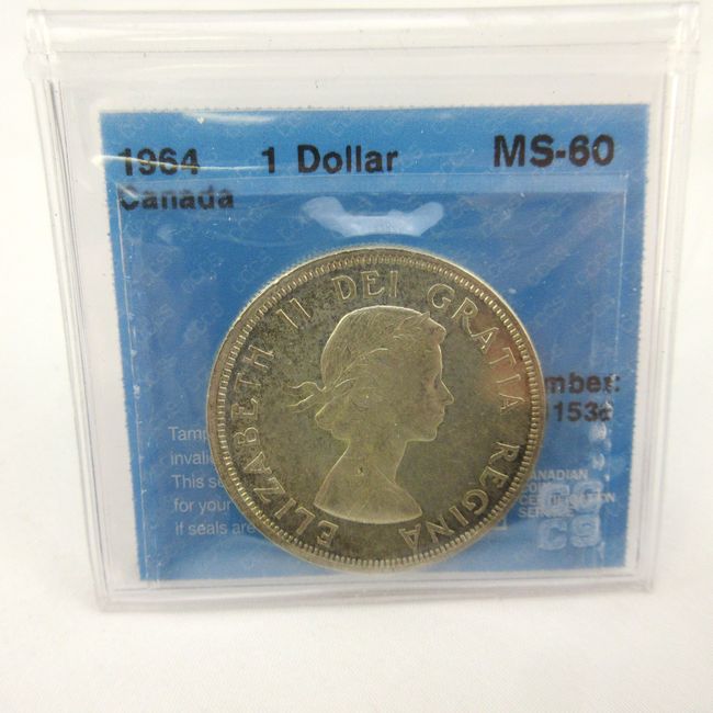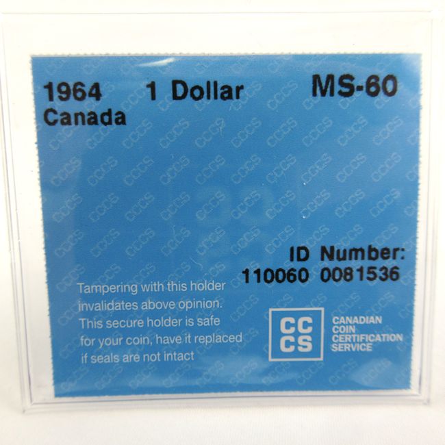 Current Bid: $21.00 [Refresh Price]YOU WILL NEED TO REFRESH THIS PAGE TO SEE UPDATED BID (Log in and this will update automatically) You must LOG IN or REGISTER to see this full page auction listing and bid. Auction is Over Winning Bid Amount: $21.00 **Lot Details: (LOT: C22) - 1964 Canada 1 Dollar coin, CCCS graded MS~60, 23.3 g of 80 per cent silver Log in to add this lot to your watch list or place a bid |