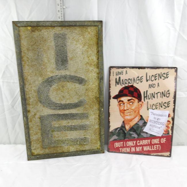 Current Bid: $7.00 [Refresh Price]YOU WILL NEED TO REFRESH THIS PAGE TO SEE UPDATED BID (Log in and this will update automatically) You must LOG IN or REGISTER to see this full page auction listing and bid. Auction is Over Winning Bid Amount: $7.00 **Lot Details: (LOT: C346) - 2 signs marriage sign 17`` x 12`` repro ice sign 24`` x 13`` Log in to add this lot to your watch list or place a bid |