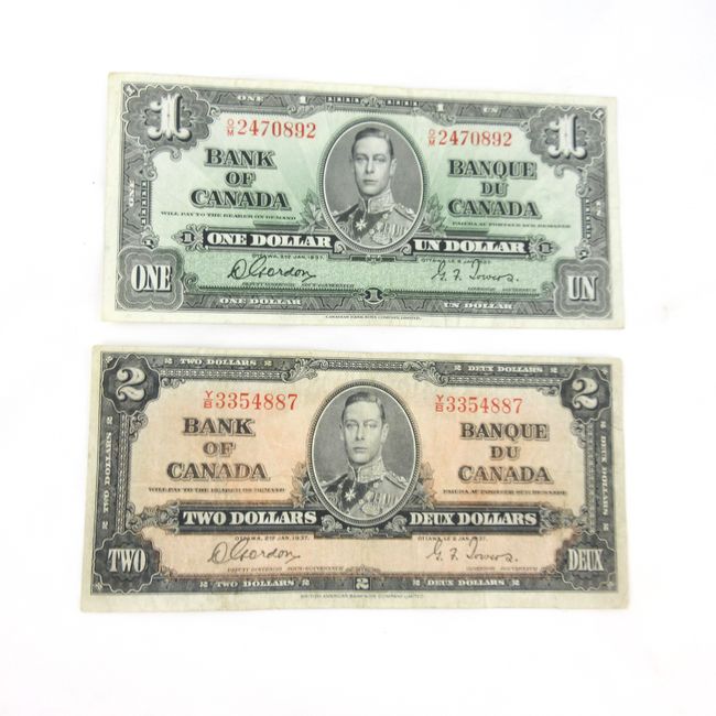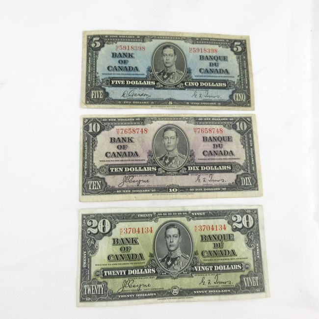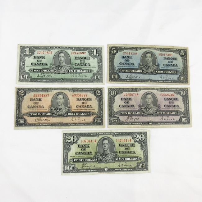 Current Bid: $102.10 [Refresh Price]YOU WILL NEED TO REFRESH THIS PAGE TO SEE UPDATED BID (Log in and this will update automatically) You must LOG IN or REGISTER to see this full page auction listing and bid. Auction is Over Winning Bid Amount: $102.10 **Lot Details: (LOT: D27) - Canada 1937, One, Two, Five, Ten and Twenty~Dollar Banknotes. Strong King George VI Era Banknotes with No Issues. Log in to add this lot to your watch list or place a bid |