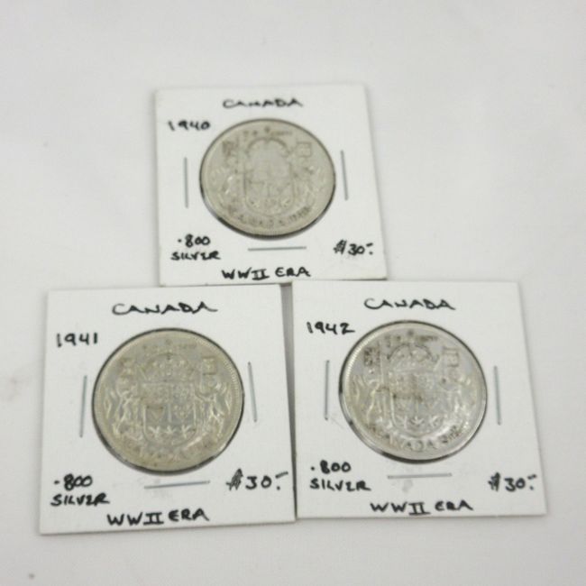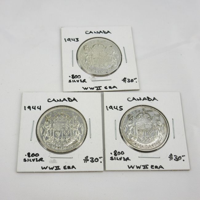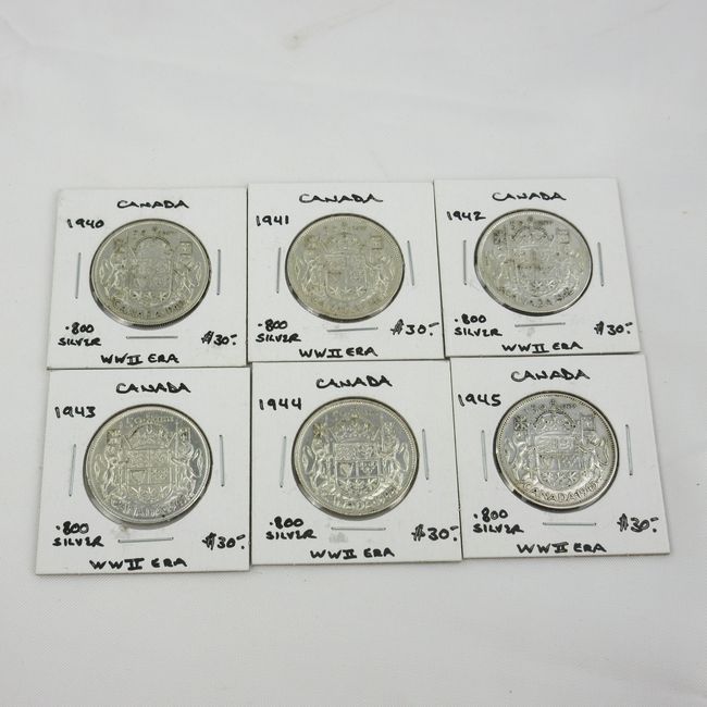 Current Bid: $77.10 [Refresh Price]YOU WILL NEED TO REFRESH THIS PAGE TO SEE UPDATED BID (Log in and this will update automatically) You must LOG IN or REGISTER to see this full page auction listing and bid. Auction is Over Winning Bid Amount: $77.10 **Lot Details: (LOT: D28) - Canada 1940,1941,1942,1943, 1944 and 1945 Silver Half Dollars. These Six Coins are .800 Silver, WWII Era, King George VI, Silver Halves in Great Condition. Log in to add this lot to your watch list or place a bid |