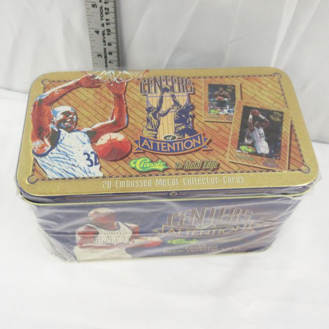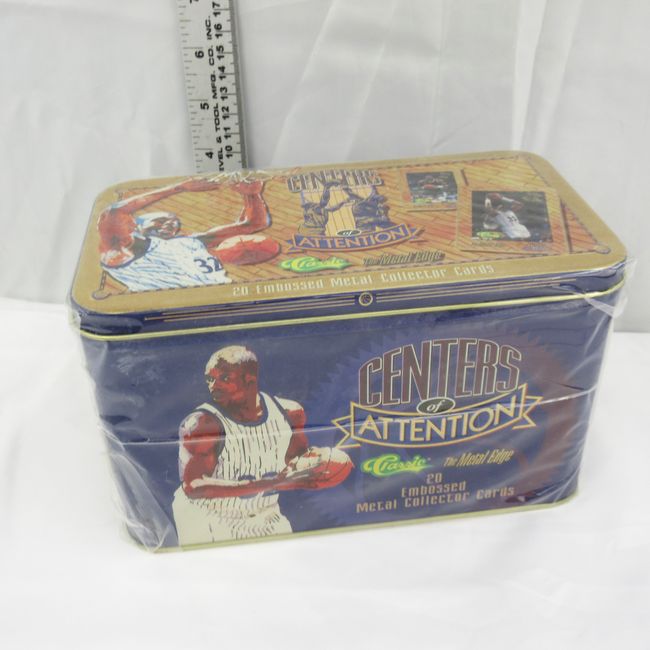 Current Bid: $22.00 [Refresh Price]YOU WILL NEED TO REFRESH THIS PAGE TO SEE UPDATED BID (Log in and this will update automatically) You must LOG IN or REGISTER to see this full page auction listing and bid. Auction is Over Winning Bid Amount: $22.00 **Lot Details: (LOT: E14) - Sealed and unopened ``Centers of Attention`` 1995 Classic The Metal Edge 20 METAL Card Tin SET. This limited edition collectors` item features some of the greatest basketball centers of all time, including Dikembe Mutombo, Patrick Ewi Log in to add this lot to your watch list or place a bid |