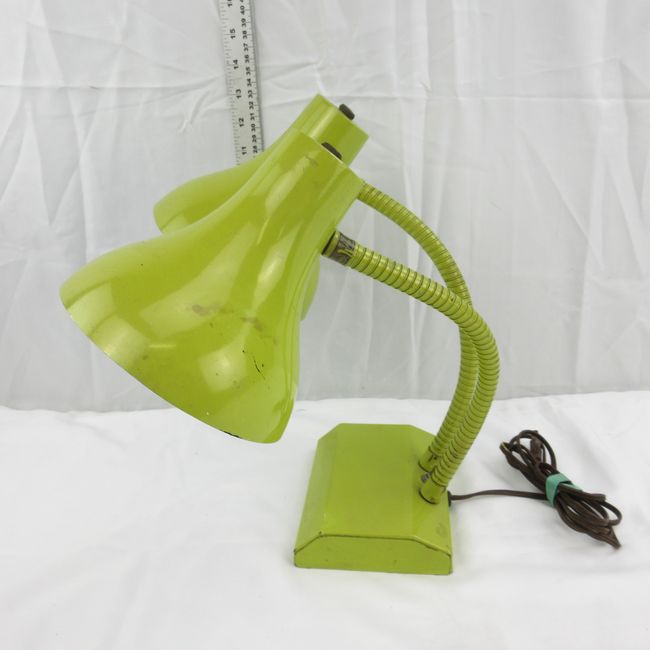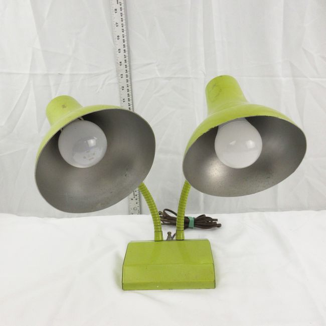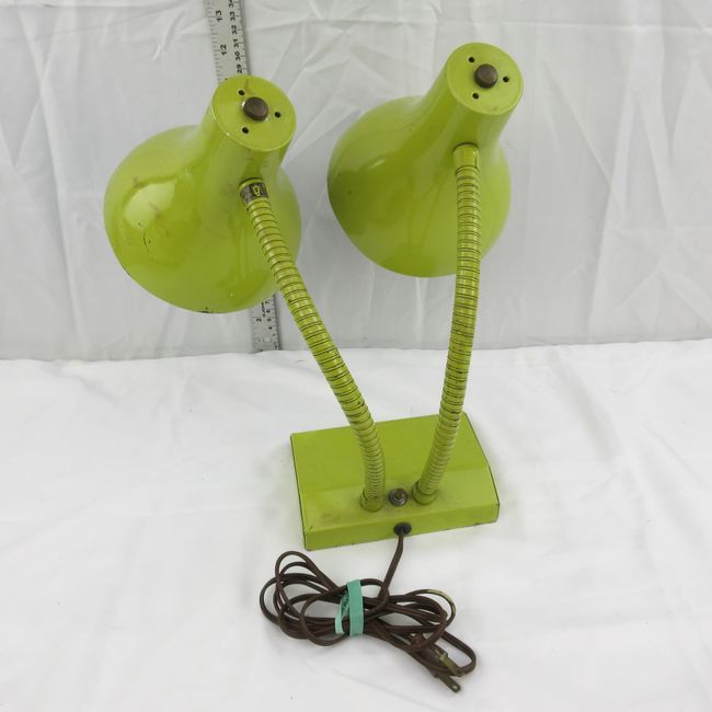 Current Bid: $18.00 [Refresh Price]YOU WILL NEED TO REFRESH THIS PAGE TO SEE UPDATED BID (Log in and this will update automatically) You must LOG IN or REGISTER to see this full page auction listing and bid. Auction is Over Winning Bid Amount: $18.00 **Lot Details: (LOT: E56) - A funky vintage retro mid century double gooseneck table/desk lamp. Great original green colour, some minor signs of age. Tested and working. Log in to add this lot to your watch list or place a bid |