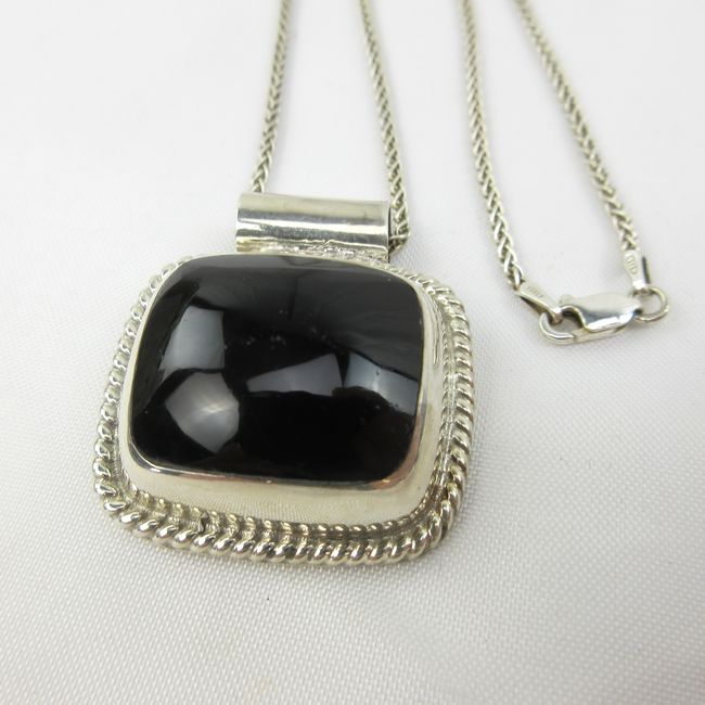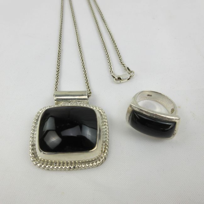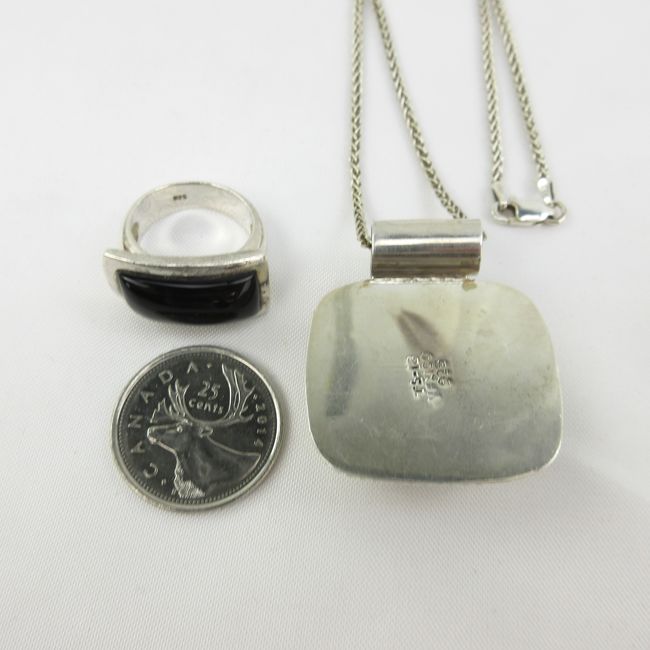 Current Bid: $20.00 [Refresh Price]YOU WILL NEED TO REFRESH THIS PAGE TO SEE UPDATED BID (Log in and this will update automatically) You must LOG IN or REGISTER to see this full page auction listing and bid. Auction is Over Winning Bid Amount: $20.00 **Lot Details: (LOT: E123) - Taxco Sterling Set 41.88 gram black Onyx Necklace and Ring, Large Bail 1 1/4`` wide with a raised Sterling black cabochon Pendant on a Sterling unique 24`` Wheat link Chain with lobster claw And Matching Sterling curved black caboch Log in to add this lot to your watch list or place a bid |