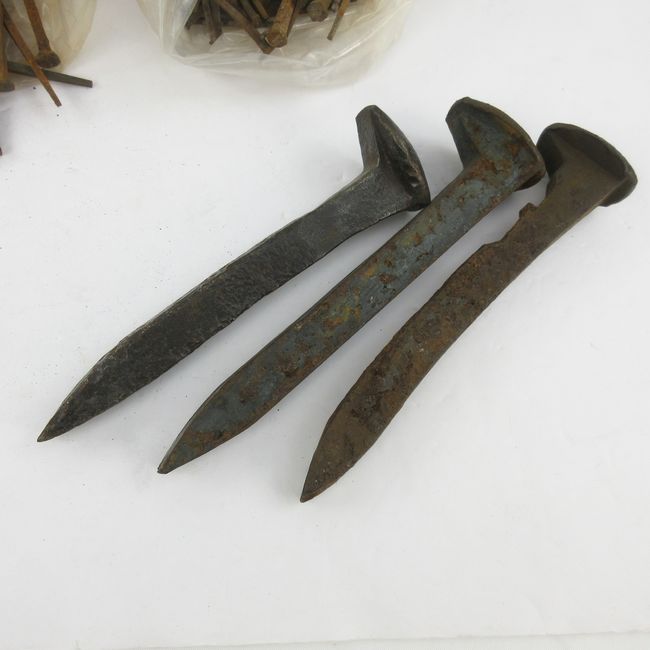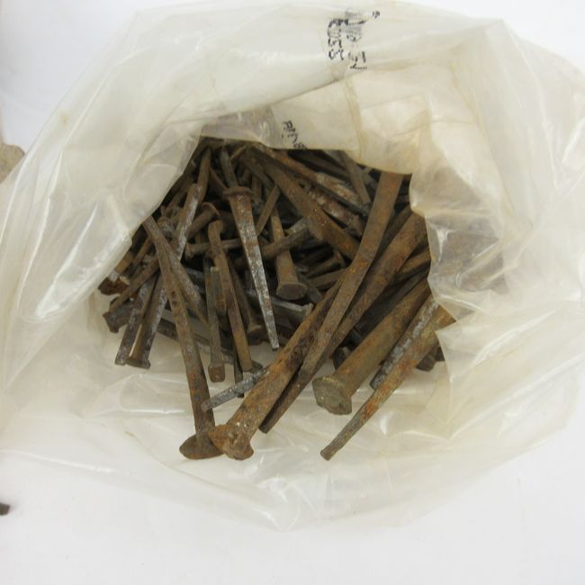 Current Bid: $5.00 [Refresh Price]YOU WILL NEED TO REFRESH THIS PAGE TO SEE UPDATED BID (Log in and this will update automatically) You must LOG IN or REGISTER to see this full page auction listing and bid. Auction is Over Winning Bid Amount: $5.00 **Lot Details: (LOT: E199) - Nails + Spikes: Bag of 115 functional square nails, most 3``L (2 lbs). Bag of 100+ functional, hand forged square iron nails, most 1`` to 1.5``L. (230g). Some light surface rust and several bent nails that can be straightened. Plus 3 Log in to add this lot to your watch list or place a bid |