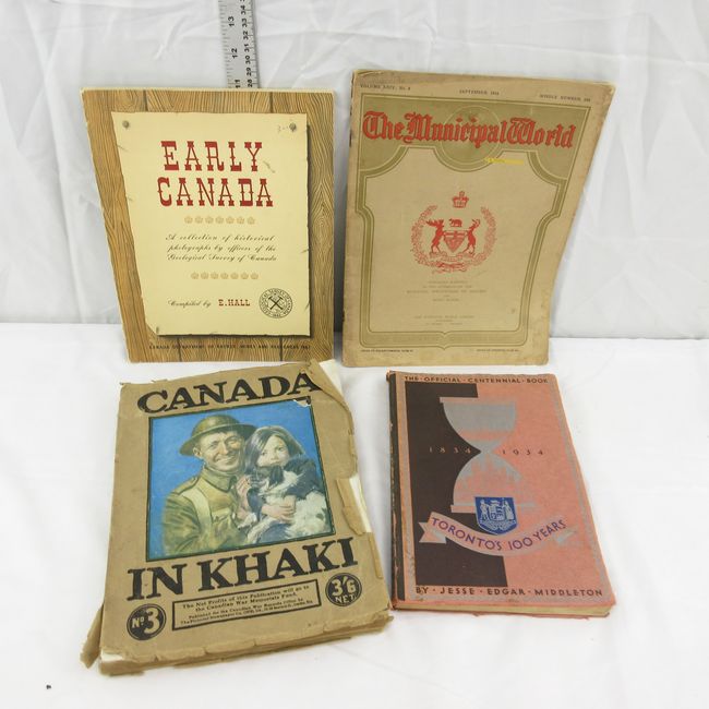 Current Bid: $32.00 [Refresh Price]YOU WILL NEED TO REFRESH THIS PAGE TO SEE UPDATED BID (Log in and this will update automatically) You must LOG IN or REGISTER to see this full page auction listing and bid. Auction is Over Winning Bid Amount: $32.00 **Lot Details: (LOT: E211) - Some amazing and old books of Canadian history. Canada in Khaki published 1919. The municipal world published 1914. Toronto 100 years published 1934. Early Canada published 1967. Log in to add this lot to your watch list or place a bid |