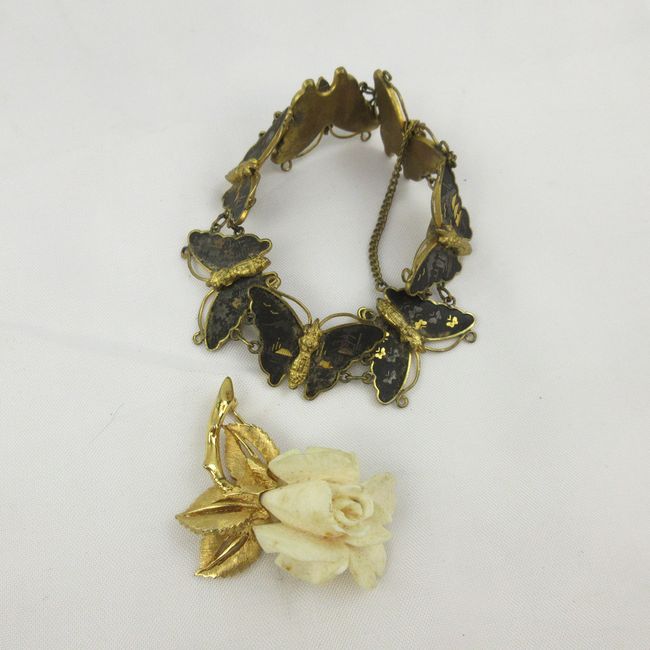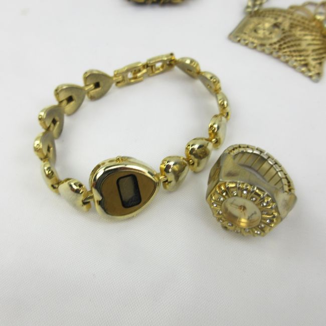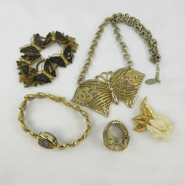 Current Bid: $5.00 [Refresh Price]YOU WILL NEED TO REFRESH THIS PAGE TO SEE UPDATED BID (Log in and this will update automatically) You must LOG IN or REGISTER to see this full page auction listing and bid. Auction is Over Winning Bid Amount: $5.00 **Lot Details: (LOT: E225) - A bag of gold tone jewelry, including a butterfly necklace, a butterfly bracelet, a flower brooch, a heart shaped watch and a ring watch. Log in to add this lot to your watch list or place a bid |
