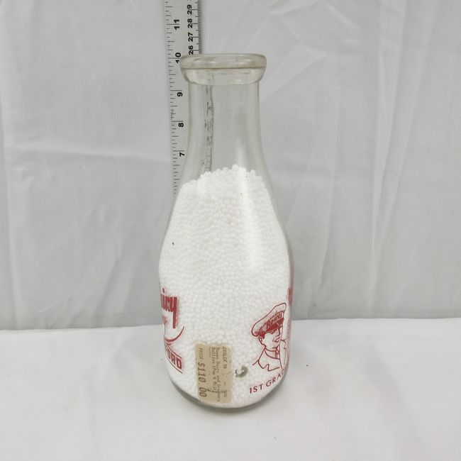 Current Bid: $11.99 [Refresh Price]YOU WILL NEED TO REFRESH THIS PAGE TO SEE UPDATED BID (Log in and this will update automatically) You must LOG IN or REGISTER to see this full page auction listing and bid. Auction is Over Winning Bid Amount: $11.99 **Lot Details: (LOT: E261) - Meaford 3 digit phone number Dairy Bottle with lovely ACL PYRO print on the battle. Great look. Full of syrene beads to simulate milk for display. Has milkman graphic back as well. Late 1940s early 1950s era. Log in to add this lot to your watch list or place a bid |