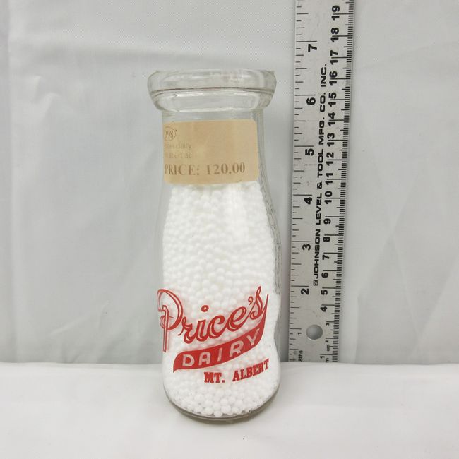 Current Bid: $9.00 [Refresh Price]YOU WILL NEED TO REFRESH THIS PAGE TO SEE UPDATED BID (Log in and this will update automatically) You must LOG IN or REGISTER to see this full page auction listing and bid. Auction is Over Winning Bid Amount: $9.00 **Lot Details: (LOT: E262) - Mt.Albert Prices Dairy bottle. Pyro ACL print Bottle. 1940s/50s era this is a smaller one and displays great. these are all in very nice collector condition Log in to add this lot to your watch list or place a bid |