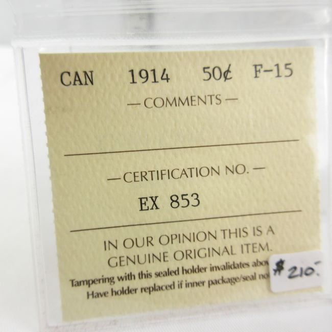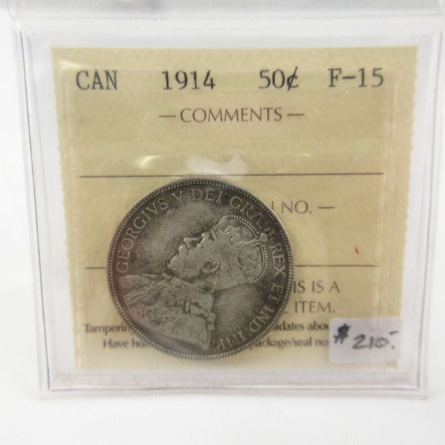 Current Bid: $44.00 [Refresh Price]YOU WILL NEED TO REFRESH THIS PAGE TO SEE UPDATED BID (Log in and this will update automatically) You must LOG IN or REGISTER to see this full page auction listing and bid. Auction is Over Winning Bid Amount: $44.00 **Lot Details: (LOT: F7) - Canada 1914 Silver Half Dollar, ICCS Certified F~15. Strong Strike on this Early King George V Half Dollar with No Distractions. Log in to add this lot to your watch list or place a bid |